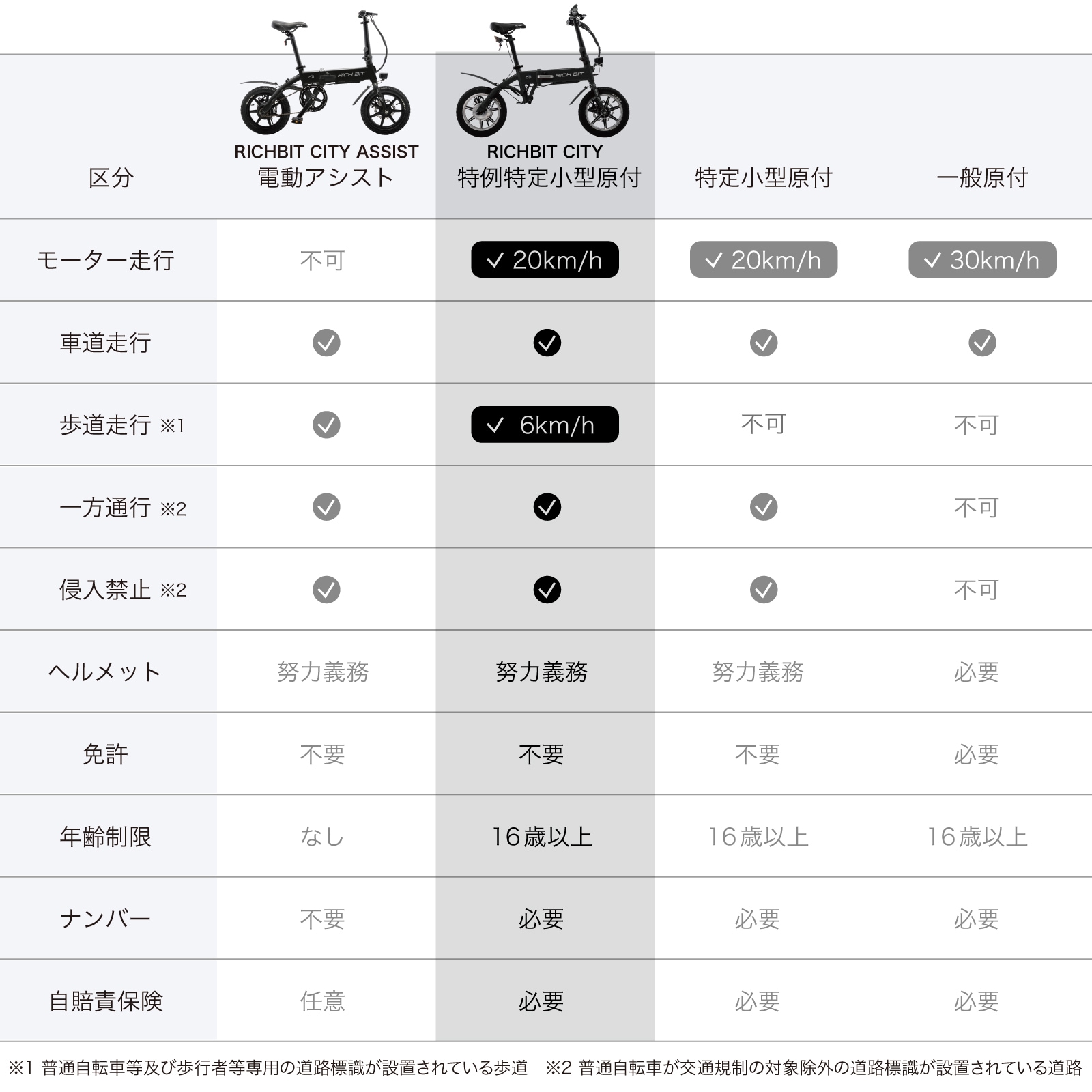 さらに追加条件を満たす「特例特定小型原動機付自転車」であれば、最高速度を6km/hに制限して歩道を走ることも認められています。基本的には電動キックボードが適用対象になりますが、“RICHBIT CITY”は自転車でも電動キックボードでもない、最新型の「特例特定小型原動機付自転車モデル」です。