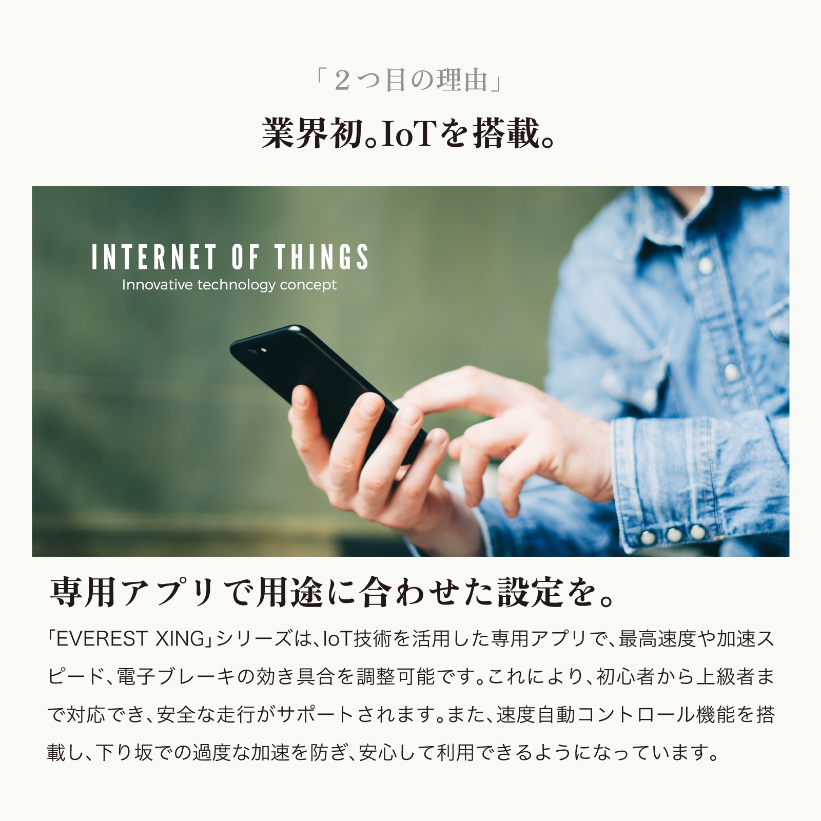 IoT搭載のEVEREST XING15シリーズ。スマートフォン(Android・iOS対応)と車体をBluetoothで連携し、スピードの調整など専用APPを通じコントロール可能です。先進技術でユーザーに合う最適な乗り方を設計できます。