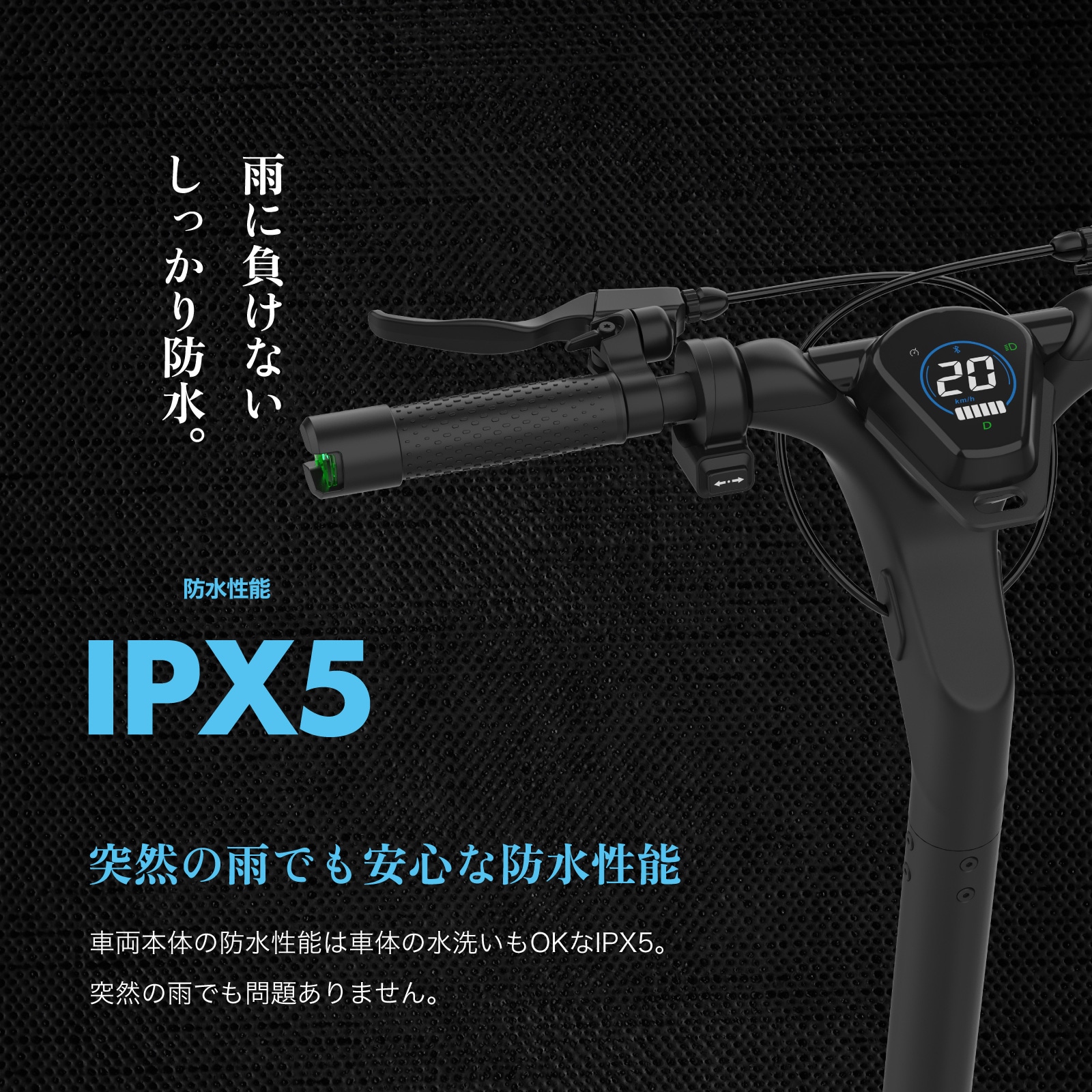 防水性能はIPX5、突然の雨でも故障の心配はありません。
