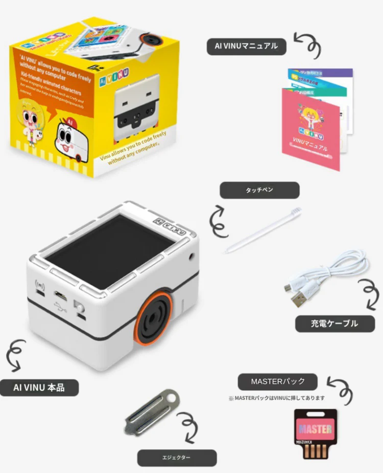 VINU(ビヌ)はフルカラーLCDが搭載されているVINUパッドと両輪のVINUカーで構成されます。 基本搭載されているプログラムはVINUカーコンテンツが搭載されています。