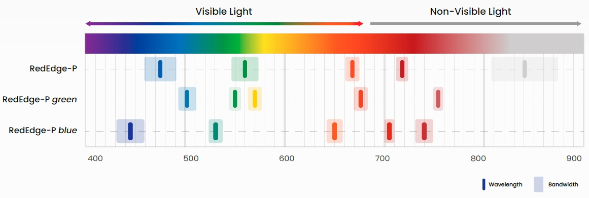RedEdge-PBlue 475(32), Green 560(27), Red 668(14), Red Edge 717(12), Near-IR 842(57)