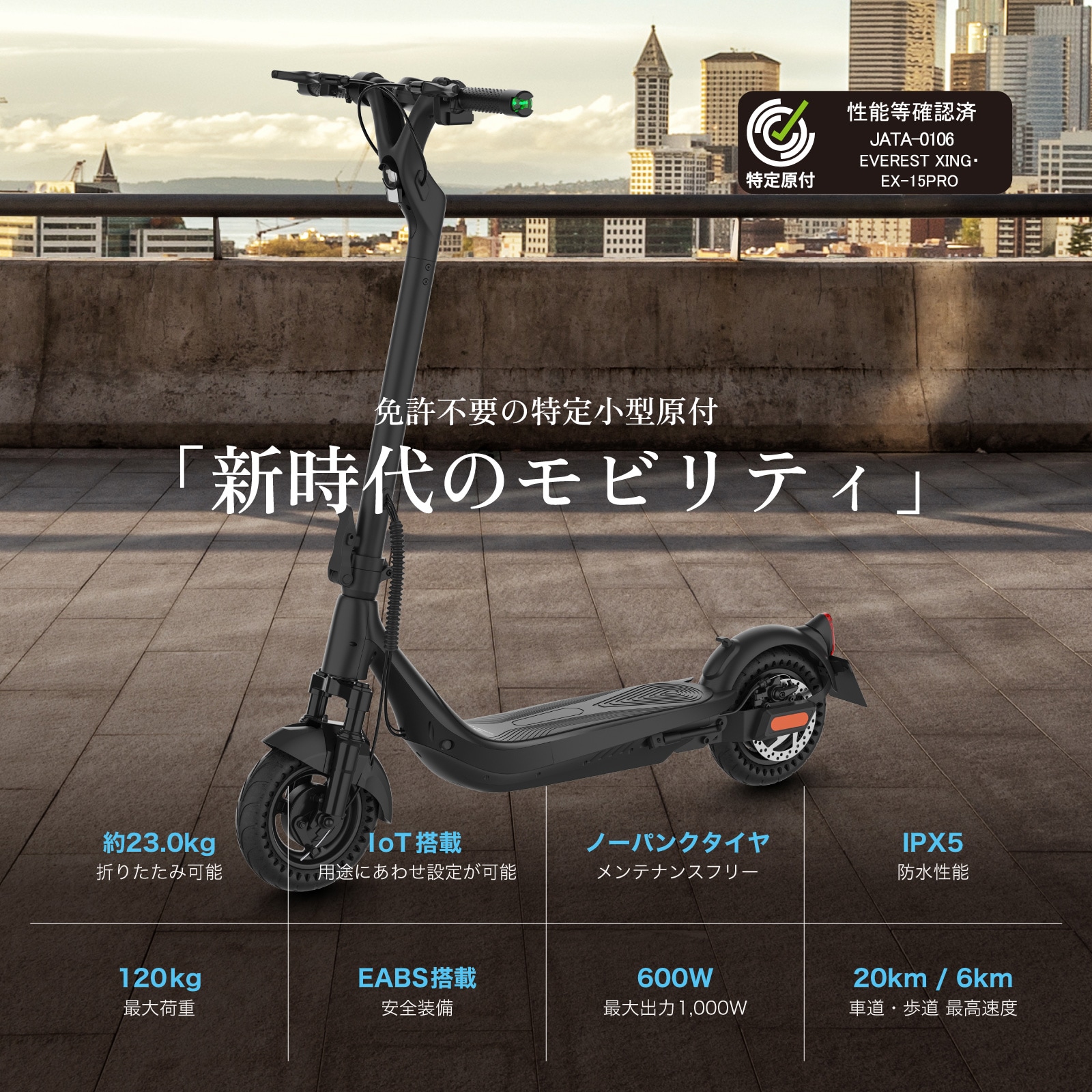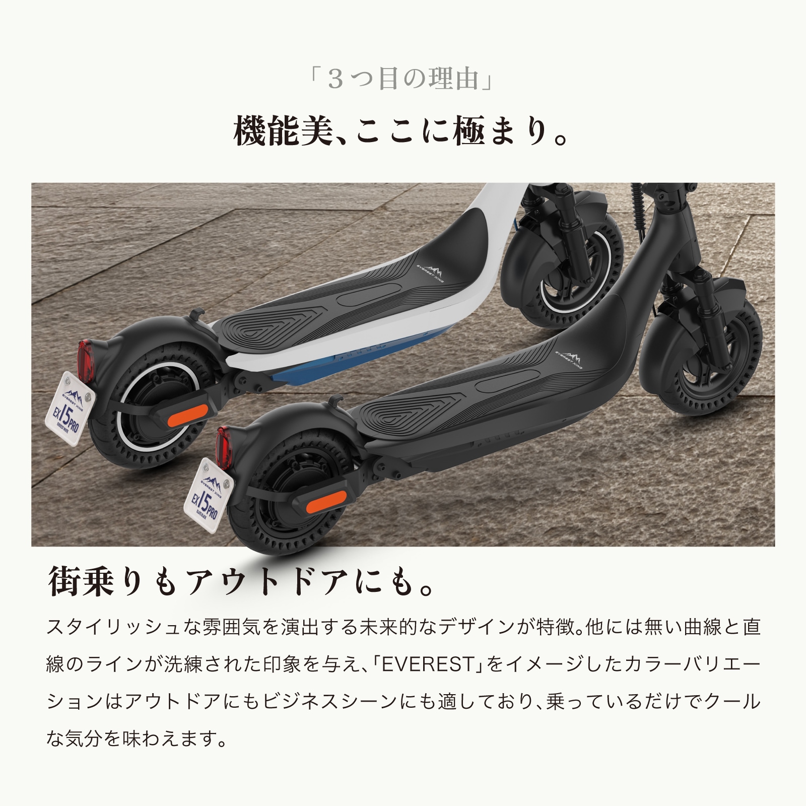 EVEREST XING EX15 PROは日本初600Wモーター搭載の電動キックボード型の特定小型原動機付自転車です。