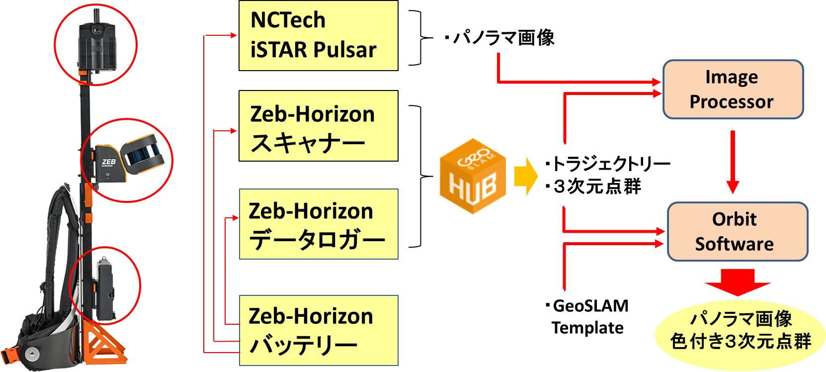 ZEB Discoveryでスキャンデータと360度カメラ画像を取得した後、GeoSLAM HUBでスキャン経路のトラジェクトリーデータ及び3次元点群データをエクスポートし、それらをi-STAR Pulsarの360度画像データと一緒にZeb-Discovery Image Processorで処理します。その結果を元に、GeoSLAM社が提携しているモバイルマッピングソフトウェアプロバイダーのORBIT GT社ソフトであるORBIT 3DM Feature Extraction BackPack Editionの中で処理することによりトラジェクトリー情報、3次元点群、距離情報を含む360度パノラマ画像等で表示される完全デジタル化された環境空間を構築できます。