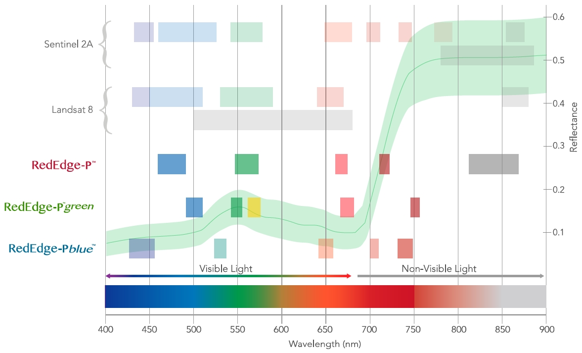 RedEdge-PBlue 475(32), Green 560(27), Red 668(14), Red Edge 717(12), Near-IR 842(57)