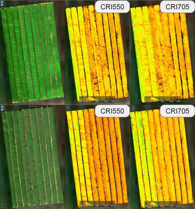 Photochemical Reflectance Index(PRI)やCarotenoid Reflectance Index(CARI)などの指標を用いることで、目視では確認できない光合成効率の低下やストレス応答を検出できる可能性があります。これらの解析は、干ばつ、養分不足、病害などの影響を早期に把握し、適切な管理判断につなげるための有効な手段となります。