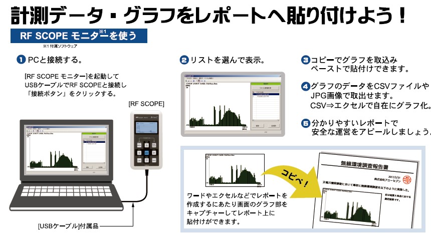 電波環境チェッカー「RF Scope」は、無線環境をチェックして計測したデータをPCに読み込んで、履歴として残せます。また表示したグラフをコピーしてWordやExcellに貼り付けることも可能です。このため計測した電波データを報告書に反映させることも容易にできます。■主な補助機能