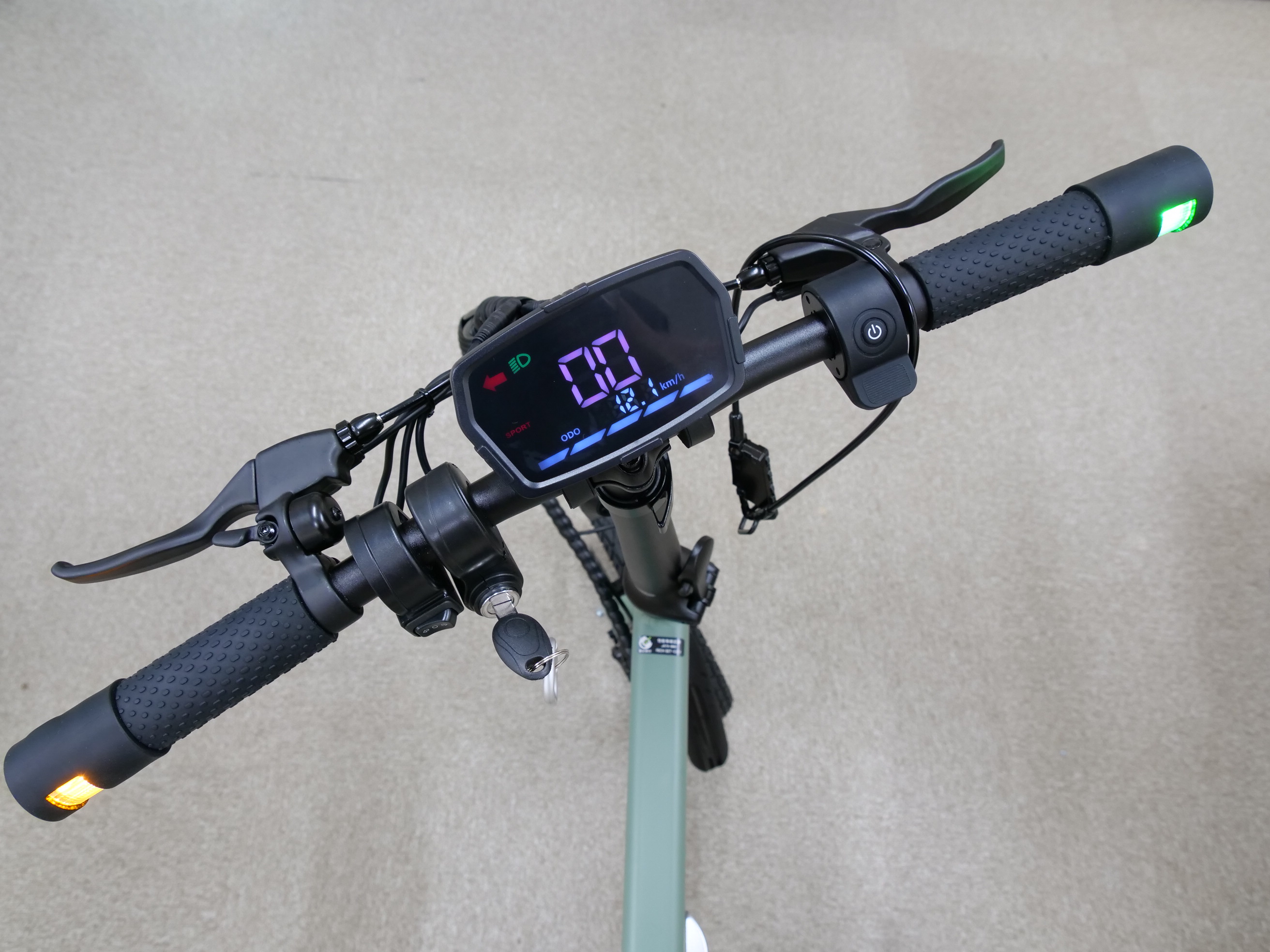 走行はアクセルバーを押すだけなので操作は簡単。バイクに慣れていない人でも、自転車のように気軽に運転ができ、レジャー感覚で移動を楽しめます。坂道でも問題なく走行できます。大型ディスプレイは、バッテリーの残量や速度等が確認できて便利です。LEDヘッドライト、ハンドルグリップにウィンカーライトがあり安全装備も充実。防犯対策として、鍵をかけなければ電源が入りません。走行する場所により走行モードを切り替えて走行してください。